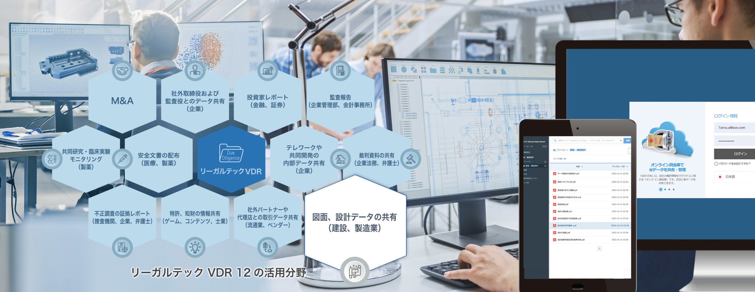 大容量の図面データをハードディスクや、DVDに焼き付けたり、USBで持ち歩くなど、紛失、盗難、データ喪失のリスクがあり、無料の大容量データ転送サービスを使うことは、万が一のデータ漏えいを考えると取引先の要求する管理体制を構築するには不十分でした。機密情報共有管理システム「リーガルテックVDR」を活用することで、製造・設計データを素早く、安全に共有することが可能となります。